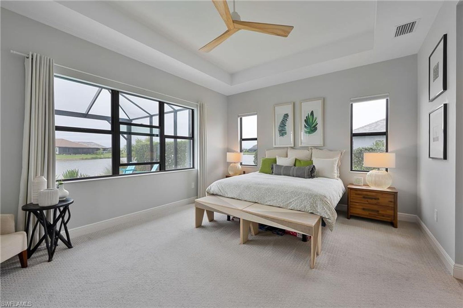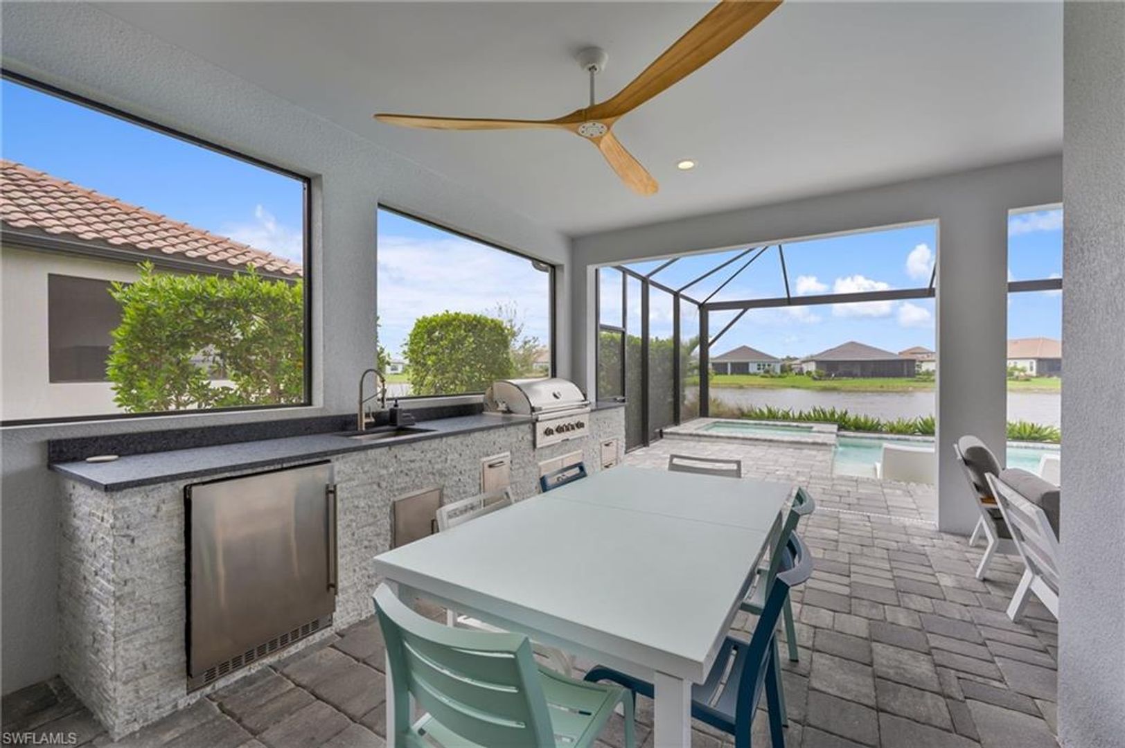 Welcome to Skysail—your resort-style lakefront retreat with wide-water views. This upgraded Sea Mist model in the COVE home area, Lot lines are wider, offers 3 bedrooms + a den with glass French doors, 2.5 baths, and an open great room plan with coffered ceilings. Coastal exterior elevation with impact-resistant windows/doors for storm-ready peace of mind. Bright, modern interior with light wood-look plank tile and carpet in the bedrooms, designer finishes, and recessed lighting. Gourmet kitchen features quartz counters, large island, walk-in pantry, 42” cabinetry, GE Café appliances, gas cooktop (Gas Neighborhood), Subway Tile backsplash with ornate range vent to outside. Private screened lanai, With No-Seeum screen and Picture box Cage, overlooks one of the prettiest Lake views with a stunning Pool/spa with a Fast and Efficient gas heater. One of the nicest lake views in the community, ideal for coffee and sunsets. This Smart-home has a tremendous outdoor kitchen area under covered Lanai. Home also boasts hardwired alarm. Cat6 wiring throughout for fast streaming and easy TV hookups. Spa-like primary suite and a full-glass shower with custom tile; Bedrooms 2 and 3 are spacious as well with excellent closet space. 3-car garage with extra storage racks installed. Amenities include a lakefront clubhouse, unfurnished!