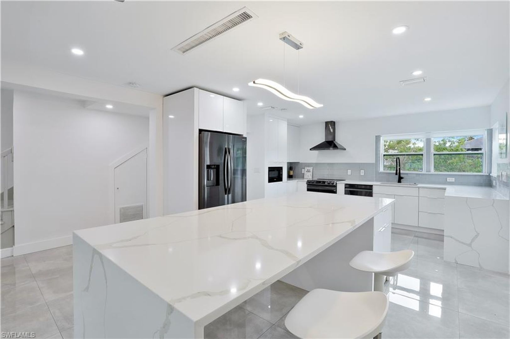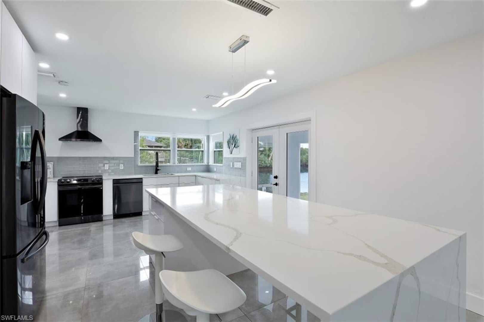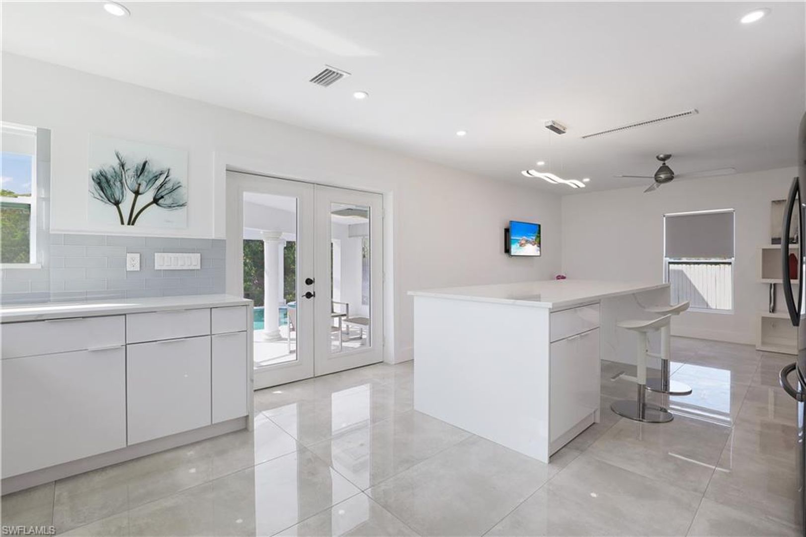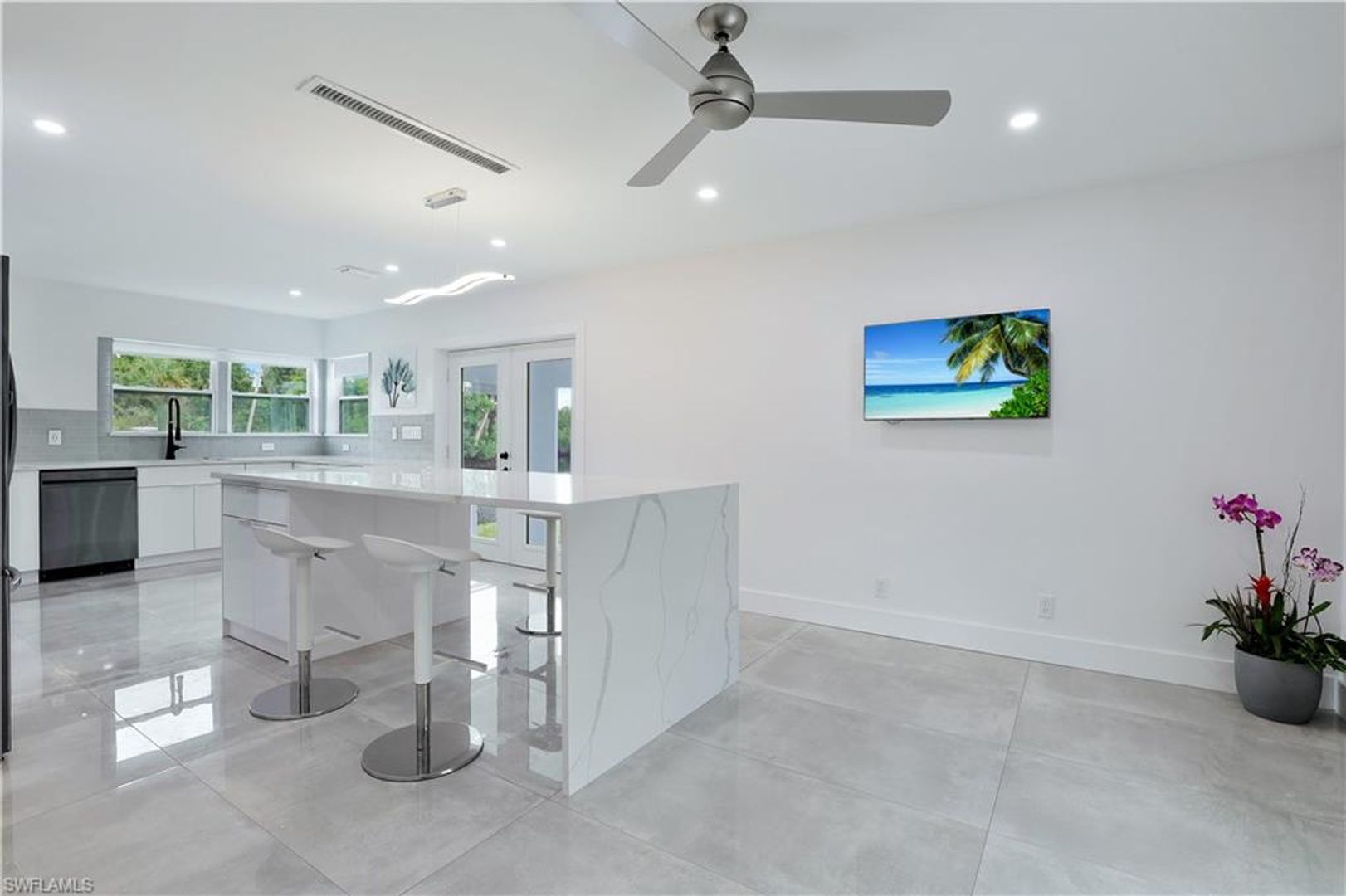 Absolutely stunning and completely remodeled 3 bedroom, 4 bath contemporary waterfront home with spa/pool and a coveted SW exposure as well as a boat dock! Call this ultra sleek, light, bright and sun filled home yours this winter season. NO association approval required. In the heart of Bayshore Arts District. According to Gulfshore Life this is "Florida's Coolest New District". Walk to Celebration Food Park , Wine Loft as well as many other laid back and charming restaurants and cafes. Incredible location close to 5th avenue, beaches and Botanical Gardens. Not only is there a 30 ft. boat dock but also a boat ramp for the boating enthusiast. On a deep water canal within Minutes to Naples Bay and Gulf and no bridges. Photos don't show it yet but there is also a brand new roof. Also pet friendly! Three Tv's: Living room, kitchen and lanai.