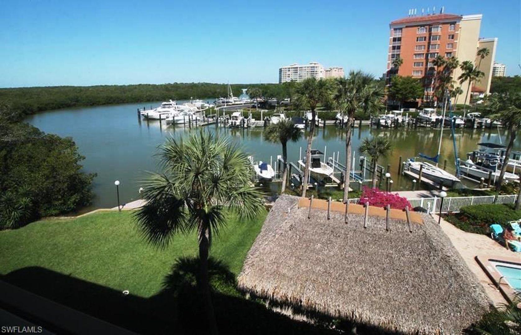 Gorgeous bay view from this 4th floor residence at "Anchorage at Vanderbilt " The Anchorage is a gated gulf access community with only 34 condominiums. This 4th floor beauty has 2 split bedrooms and 2 full baths with a spacious great room with a spectacular view off the balcony with bay views like no other. The residence has a 30' lift for a boat up to 7,000 lbs. for lease at $400 per month (boat must be registered to tenant) and private covered parking. It is minutes to the Gulf by boat. Relax by the community pool and chill out at the Chickee Hut. Located on the west side of Vanderbilt Drive and south of Wiggins Pass. (King size bed in master and guest bedroom has a Queen and a daybed) One dog allowed. Max weight 25 lbs.